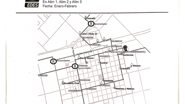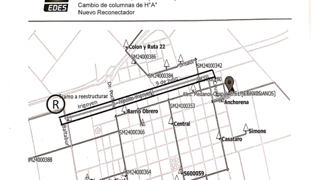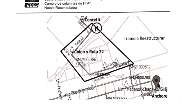 - Reemplazo de conductor de 1290 metros del Alimentador 3 – por Ruta 22 entre Colón y Las Escobas, Colón entre Drisaldi y la Ruta y Drisaldi entre Cumerlatto y Colón – la misma contempla el reemplazo del cableado existente por cable aislado de 13,2 kV, cambio de columnas de hormigón terminales de la Línea Aérea de Media Tensión existente y el reemplazo de la aislación existente por aislador tipo Line Post. Además de se instalará un Reconectador en La Ruta y Las Escobas para aislar las falla de la zona sub-urbana.
